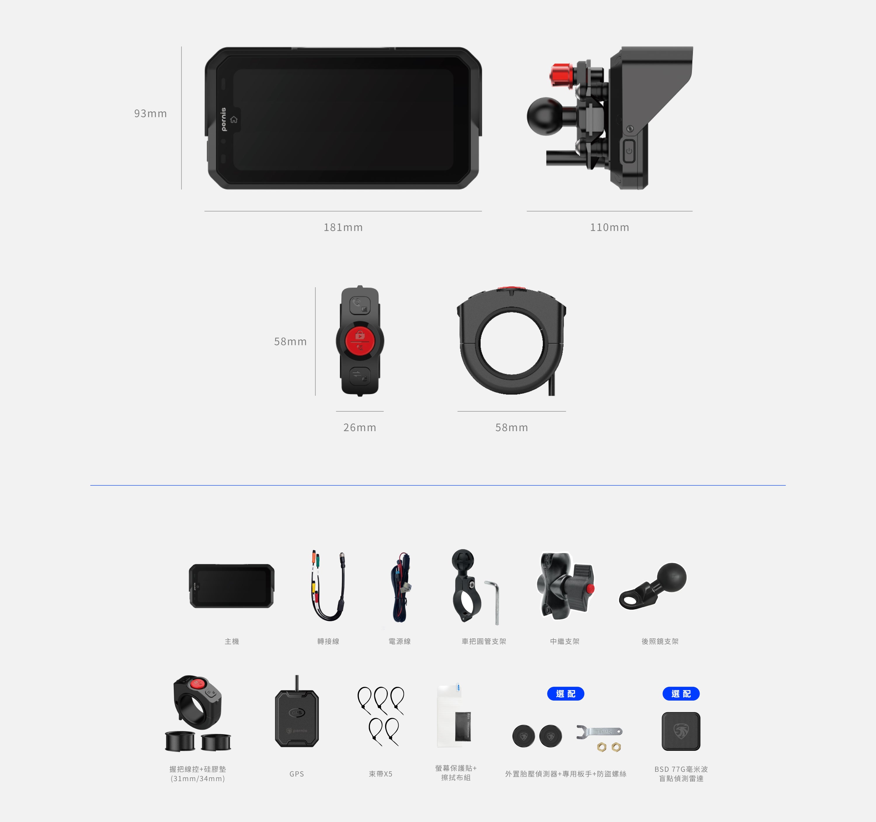 本產品整合摩托車騎士所需的騎乘導航路線資訊、數位多功能儀表、GPS測速提醒及藍牙音樂播放、可選配胎壓檢測提示及