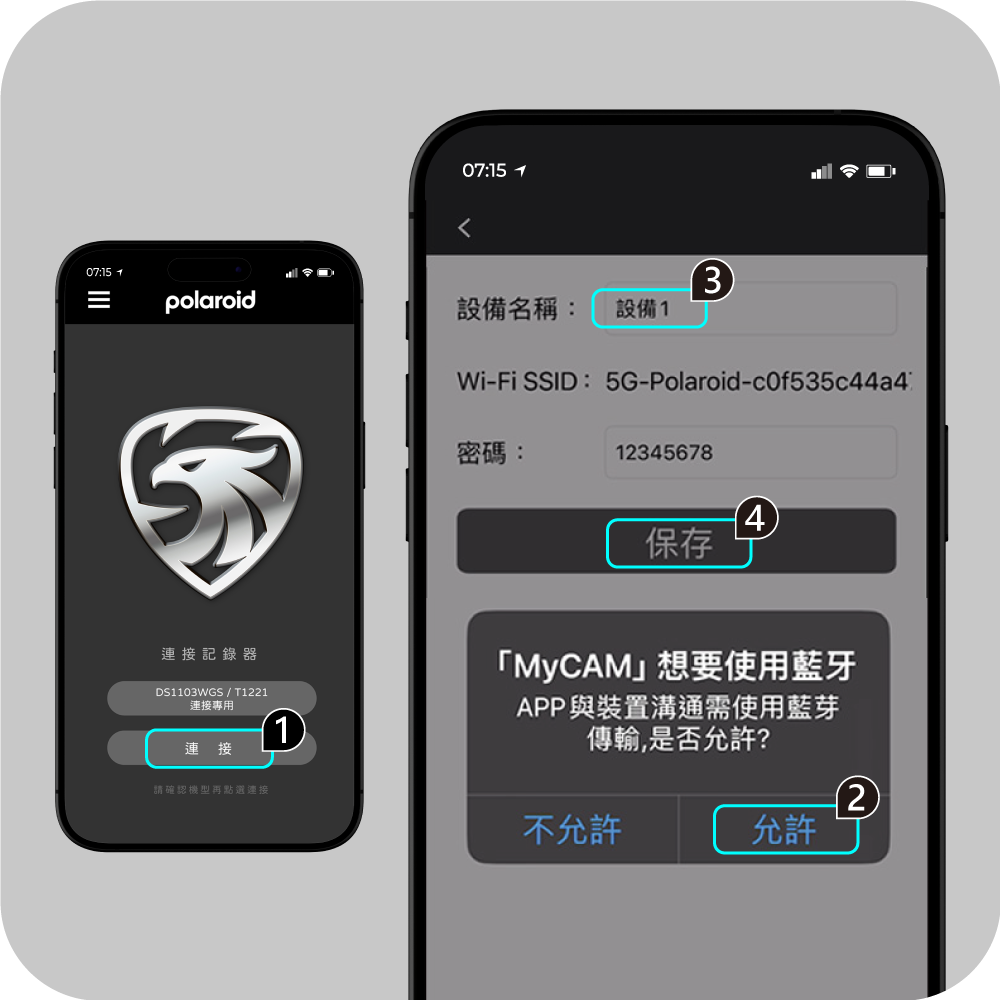 Step 4: 點選 “允許” 使用藍芽裝置。設定專屬設備名稱。例如:使用者名稱+前鏡頭(方便於APP中辨識對應記錄器) 點選 “保存”