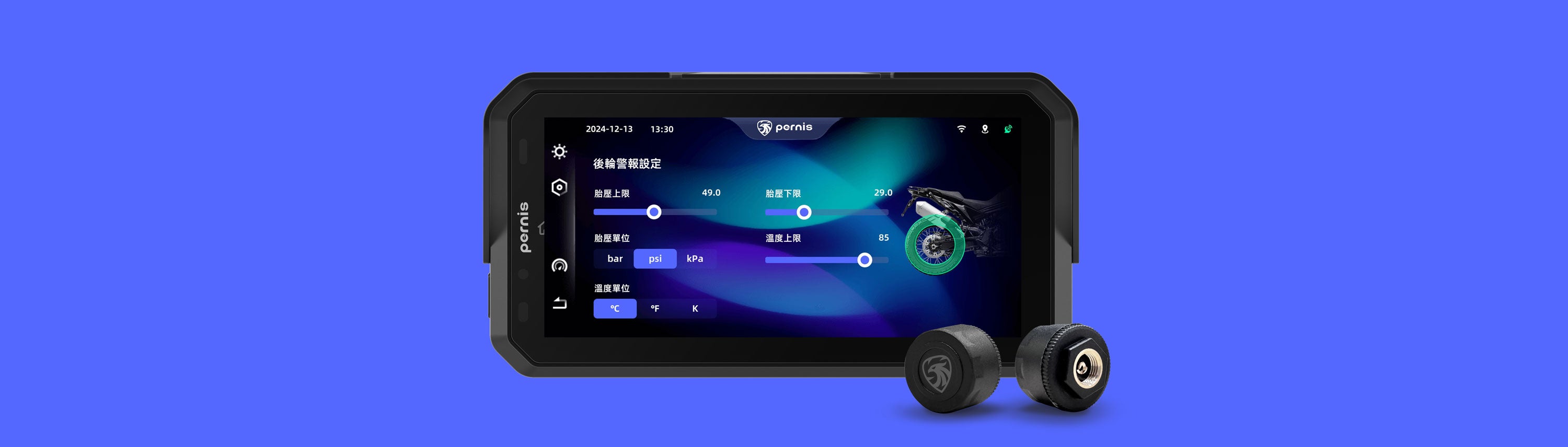 選配胎壓偵測配件即可透過胎壓設定功能選項進行胎壓及胎溫各別調整。