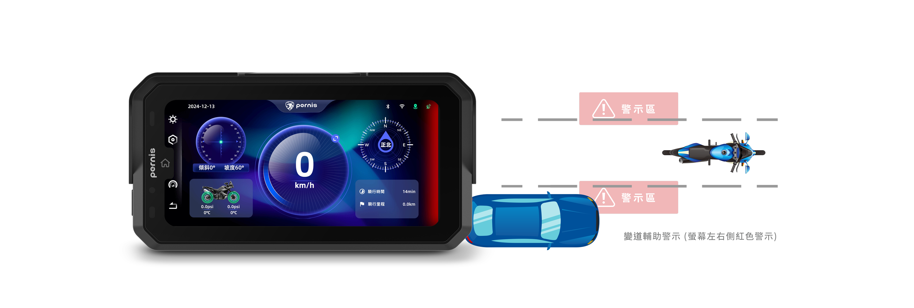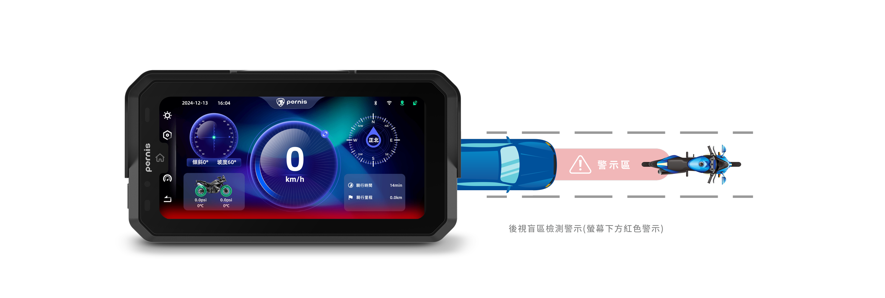 傾角&坡度偵測 / 行車時速顯示 / 指北針 / 胎壓顯示(選配) / 行車時速顯示
