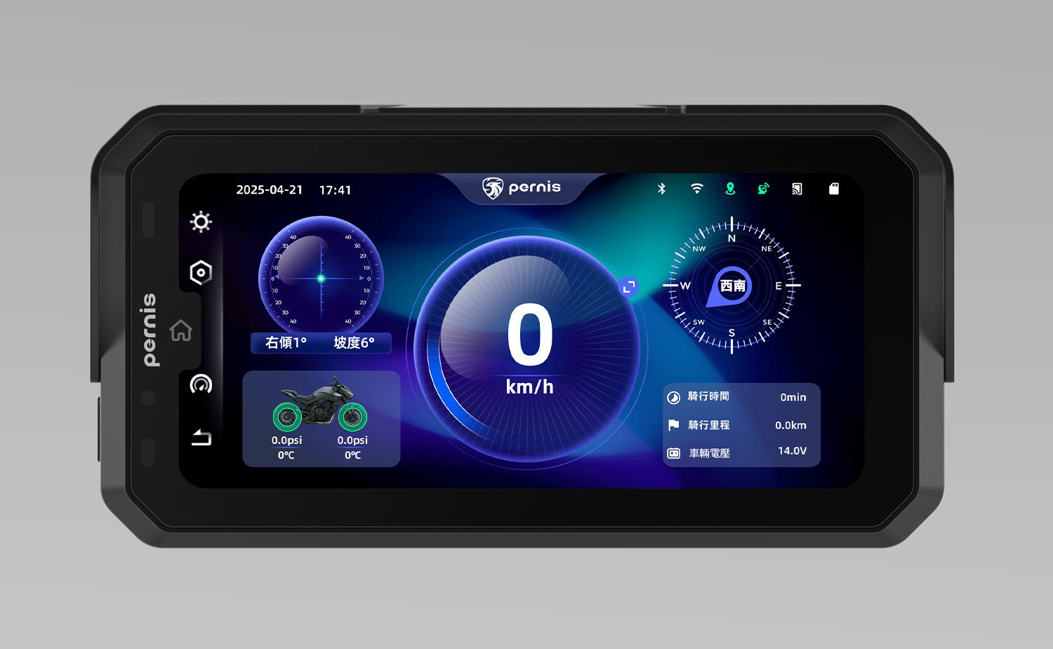 傾角&坡度偵測 / 行車時速顯示 / 指北針 / 胎壓顯示(選配) / 行車時速顯示