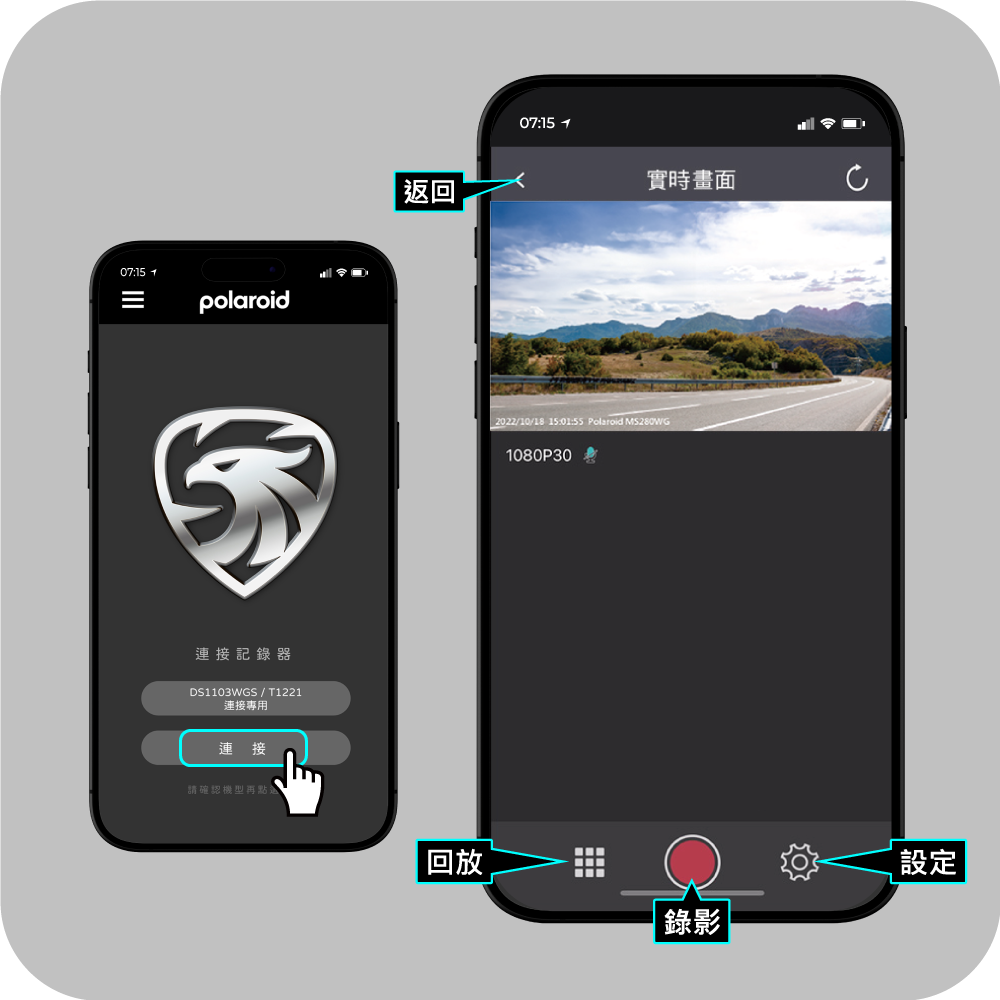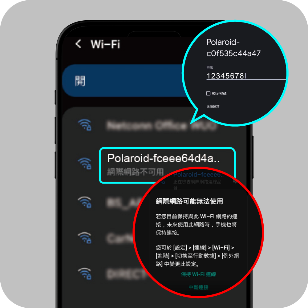 Step1: 手機設定 / 連接相關 / Wi-Fi / 選擇Polaroid-xxxxxxxx-