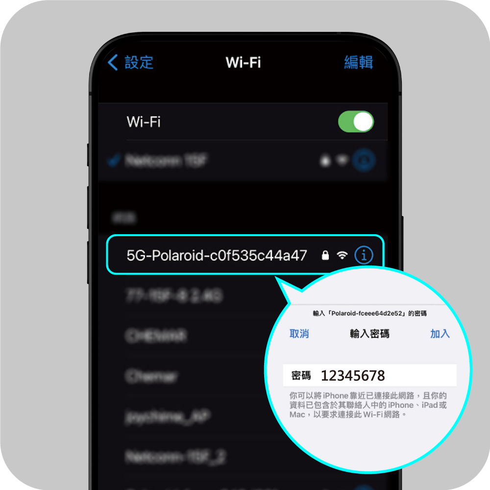Step1: 手機設定 / Wi-Fi / 選擇5G-Polaroid-xxxxxxxx-