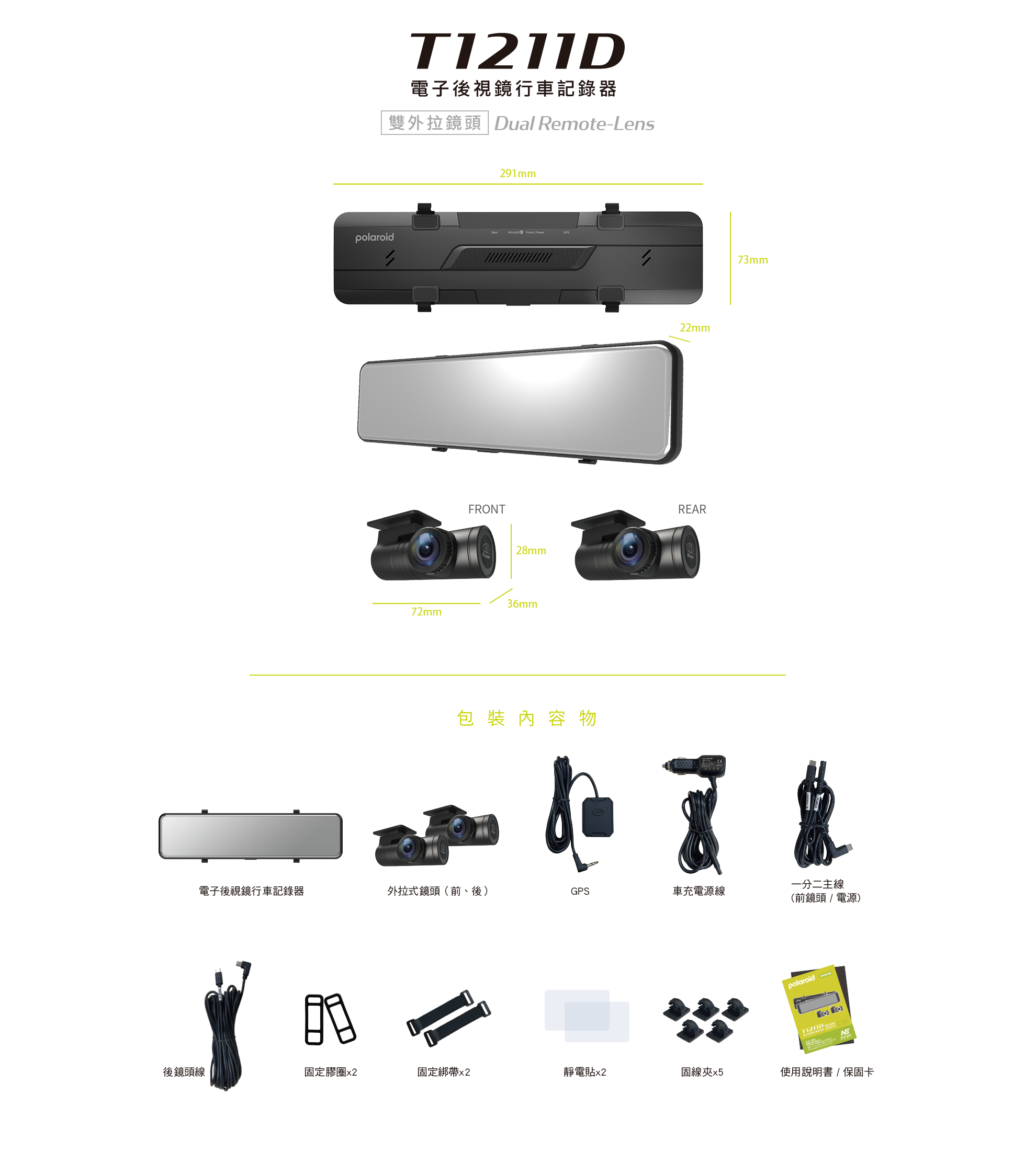 Polaroid T1211D 雙外拉電子後視鏡 汽車行車記錄器